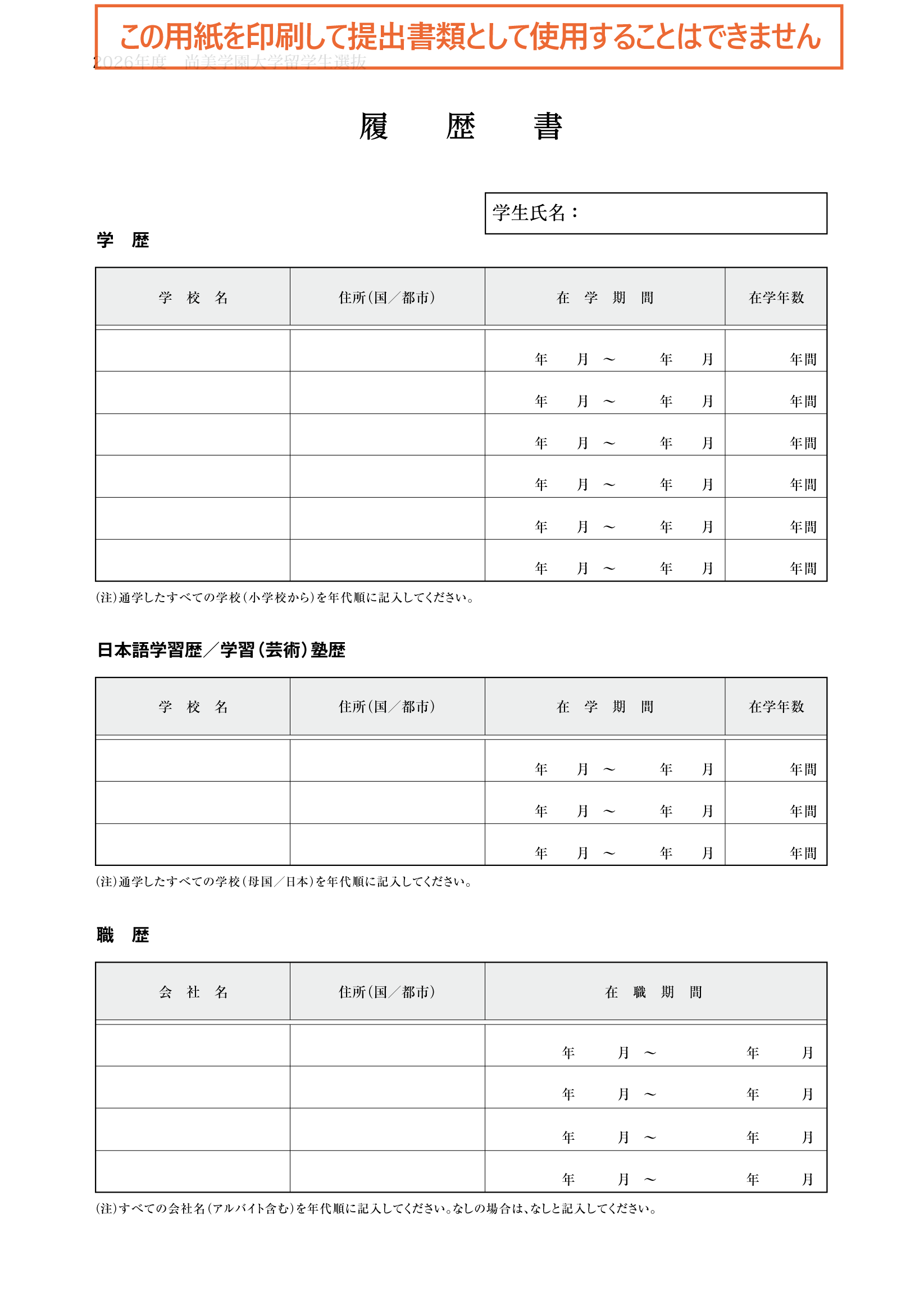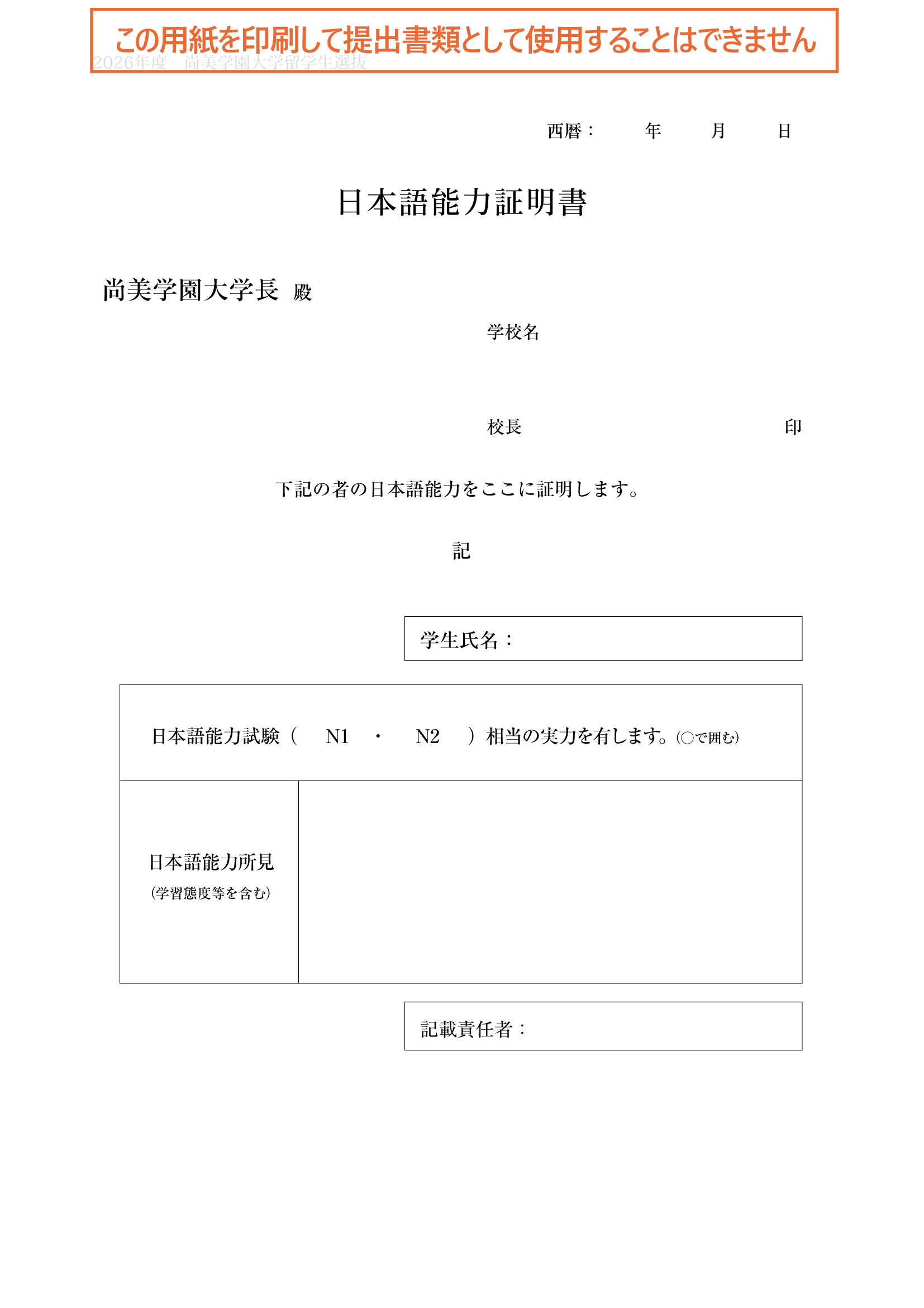 日本留学試験(日本語)または、日本語能力試験のスコア票(コピー可)もしくは、この日本語能力証明書(指定様式)を提出してください。