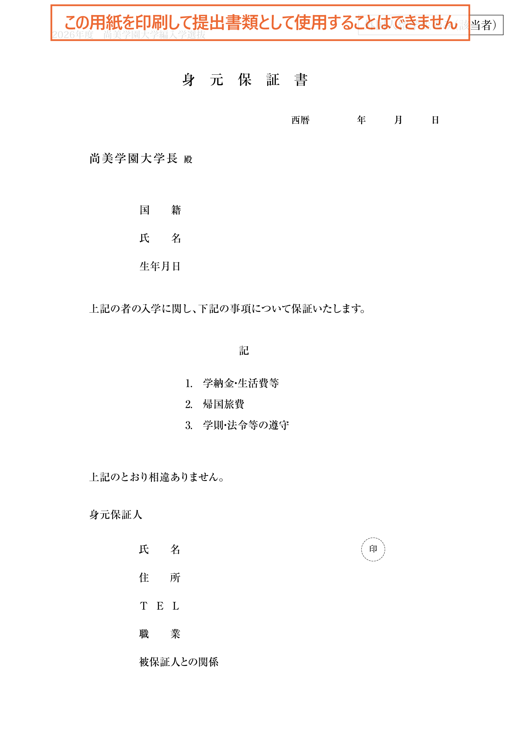 ※外国人留学生のみ追加で必要な出願書類です(保証人が作成)