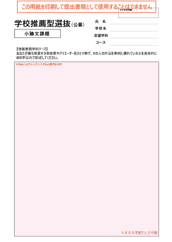 あなたが最も敬愛する芸術家やクリエーターをひとり挙げ、その人の作品を事例に優れている点を具体的に800字以内で記述してください。※書類のピンク色の部分が入力項目です