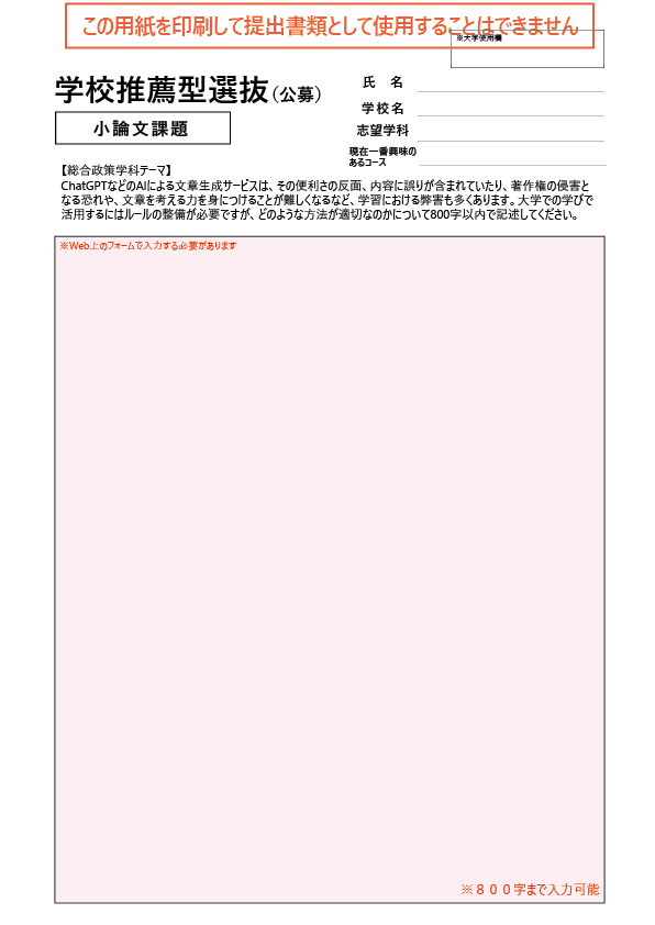 志望理由などについて、あなたの考えを簡潔にまとめ記入してください。