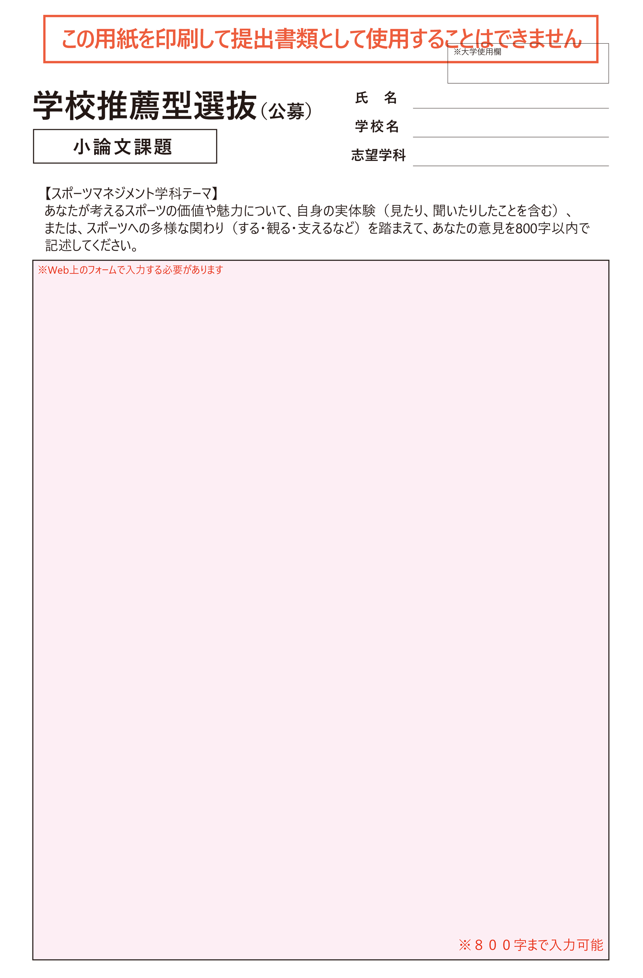 あなたが考えるスポーツの価値や魅力について、自身の実体験(見たり、聞いたりしたことを含む)、または、スポーツへの多様な関わり(する・観る・支えるなど)を踏まえて、あなたの意見を800字以内で記述してください。※書類のピンク色の部分が入力項目です
