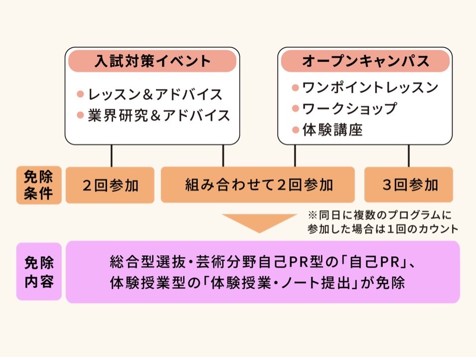 「レッスン&アドバイス/業界研究&アドバイス」に参加し一定の条件を満たした方は、総合型選抜の芸術分野自己PR型における「自己PR」または体験授業型における「体験授業・ノート提出」が免除になります。
