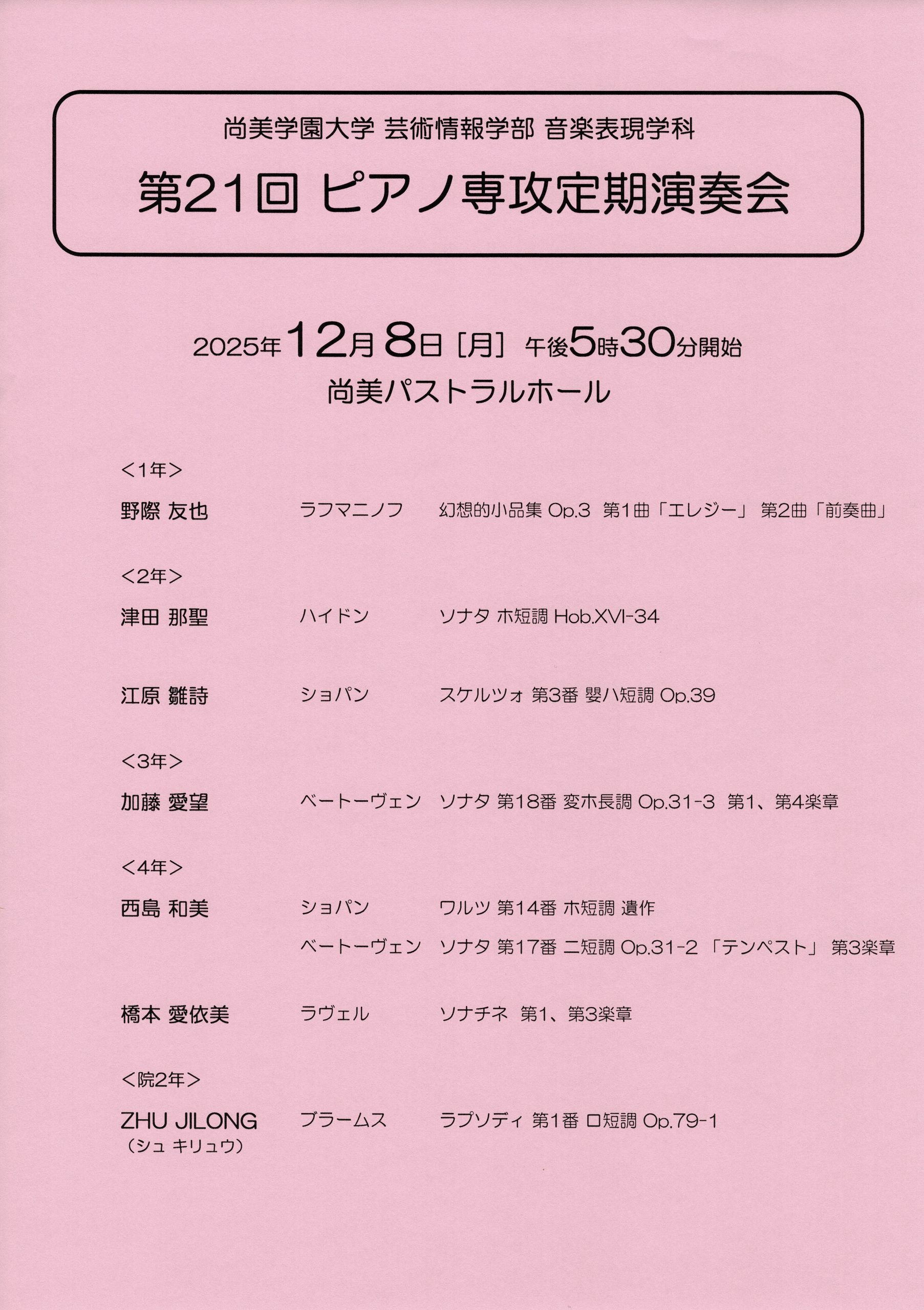 芸術情報学部 音楽表現学科* ピアノ専攻の学生による定期演奏会を、尚美パストラルホールにて下記の通り開催いたします。この演奏会は、春学期(前期)のピアノ実技試験における成績優秀者が演奏を披露いたします。ベートーヴェンやショパンをはじめ、国や時代の異なる多くの名曲を演奏いたしますので、学生一人ひとりの研鑽の成果をご覧いただけたらと思います。