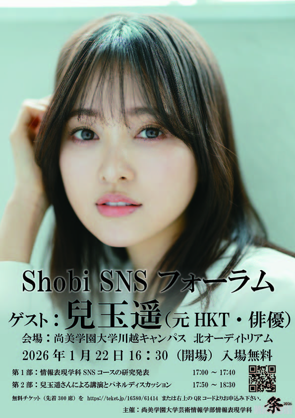 芸術情報学部 情報表現学科主催の「Shobi SNS フォーラム」をゲストに兒玉遥さん(元HKT48、俳優、Instagramのフォロワー数20万人以上)をお迎えして開催します。