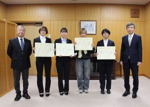 今回、学長表彰となった学生は、芸術情報研究科 情報表現専攻1年 本木希実さん、芸術情報学部 情報表現学科4年 川﨑萌衣さん、3年 飯田 菜七子さん、3年 堀口珠々さんです。