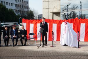 その後、来賓の皆様からご祝辞を頂戴し、記念像制作者の芸術情報学部 情報表現学科教授 宮澤光造先生から作品に込めた思いが紹介されました。