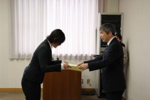 永山 賀久学長より、「公務員試験は大変な難関であり、合格には強い意志が必要だと思う。本学から合格者が出たことは大学としてもとても名誉なことである。みなさんの努力に敬意を表する。本学で学んだことを糧にしてこれからの人生を歩んでいってほしい。」との言葉がありました。
